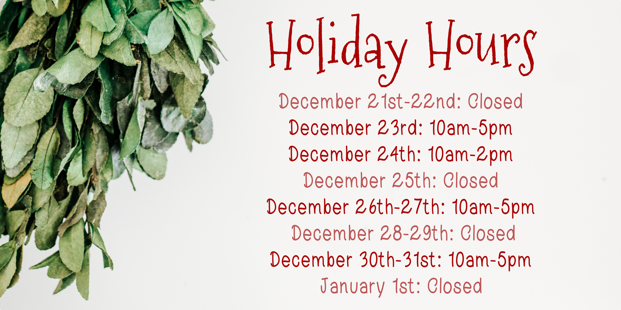 We will be closing early at 2pm on December 24th, and closed all day December 25th and January 1st.
