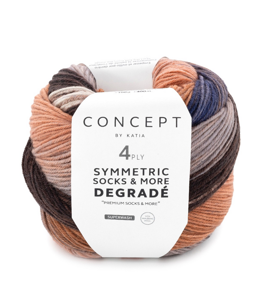 Explore new color combinations with Katia Concept 4-Ply Symmetric Socks! The 'Degradé' colour collection features a long continuous gradient plus a few stripes at the top. Each ball contains two perfect colour cycles for matching socks.